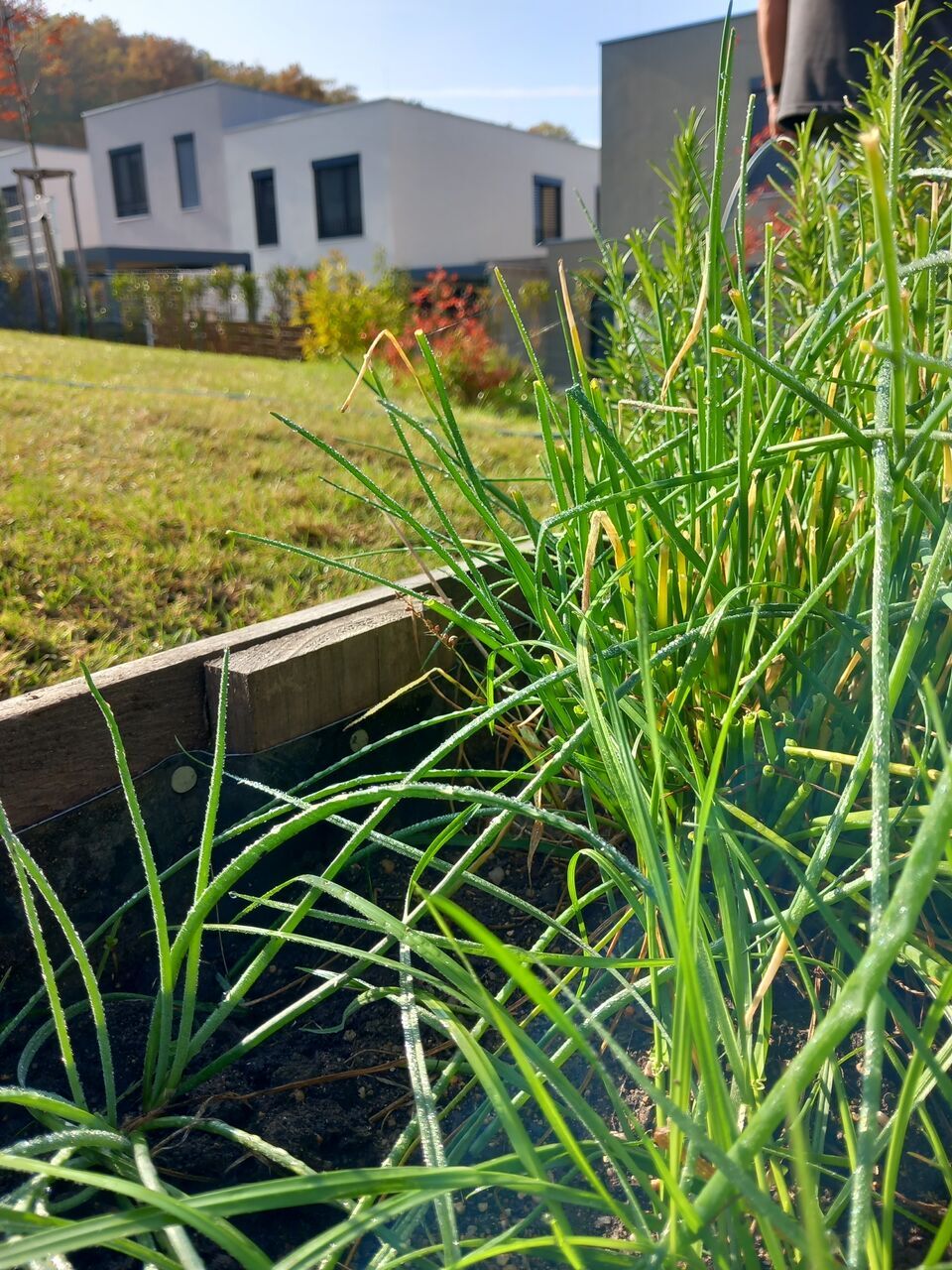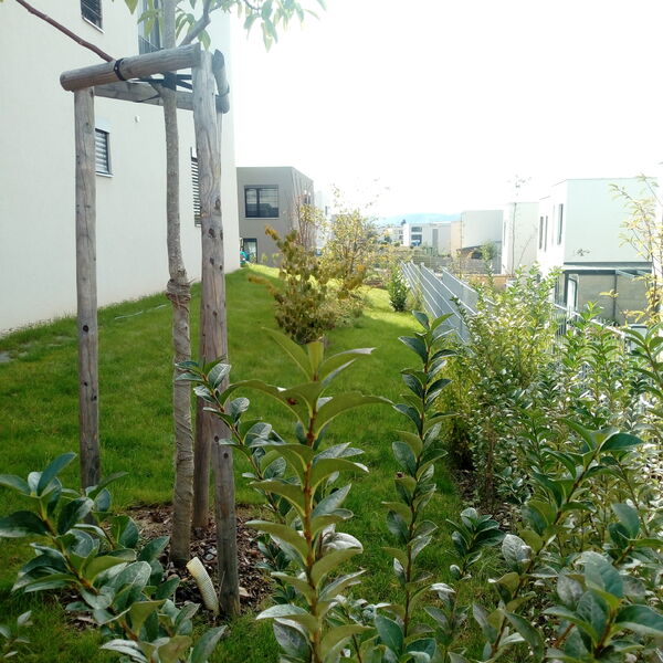 Svažitý terén zahrady u řadového domu byl rozčleněn pomocí dvou suchých kamenných zídek, kolem kterých je soustředěna výsadba trvalek a keřů. Hranice pozemku byly odděleny živým plotem a dalšími okrasnými dřevinami keřového a stromového patra. Do zahrady byla navržena i užitková část s malinami a vyvýšeným záhonem na bylinky.